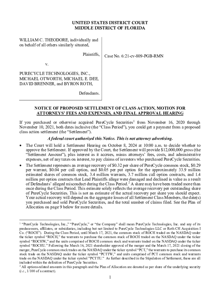 This document provides information about a proposed class action settlement involving PureCycle Technologies, Inc. for individuals who purchased or otherwise acquired PureCycle Securities during the