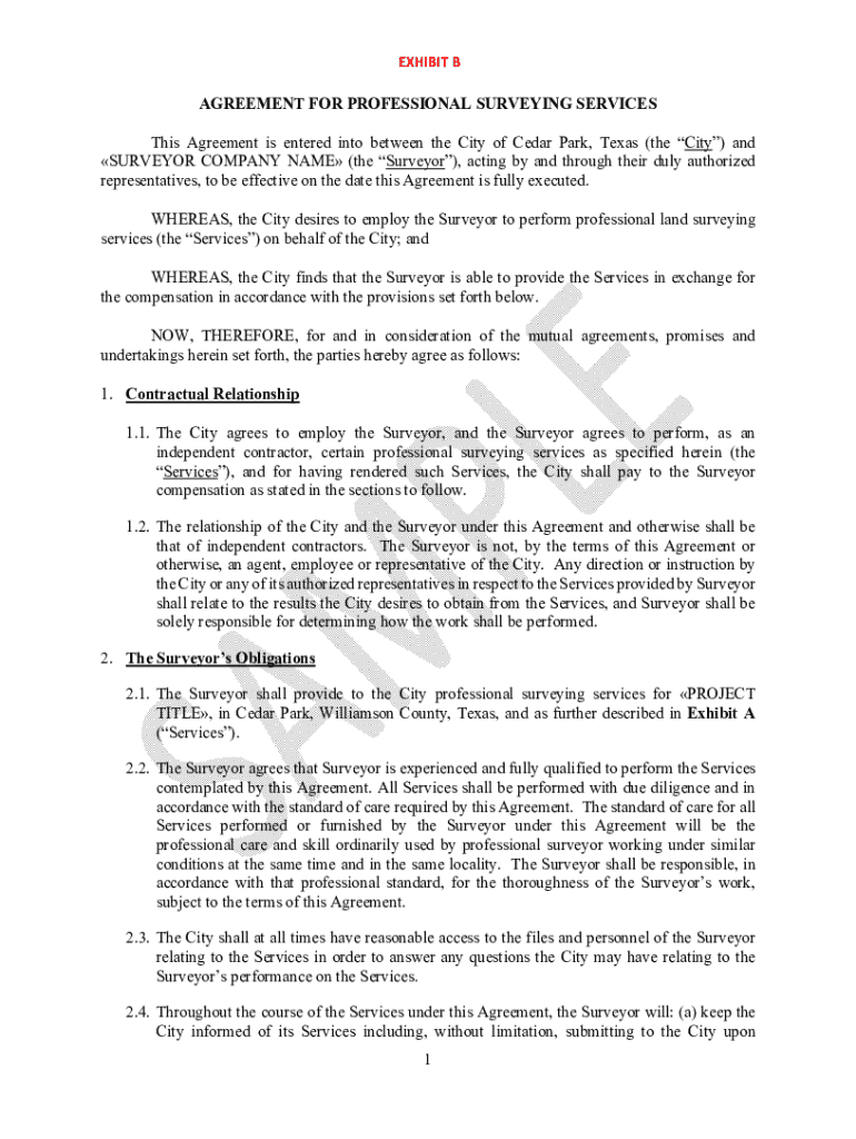 EXHIBIT BAGREEMENT FOR PROFESSIONAL SURVEYING SERVICES This Agreement is entered into between the City of Cedar Park, Texas (the City) and SURVEYOR COMPANY NAME (the Surveyor), acting by and through