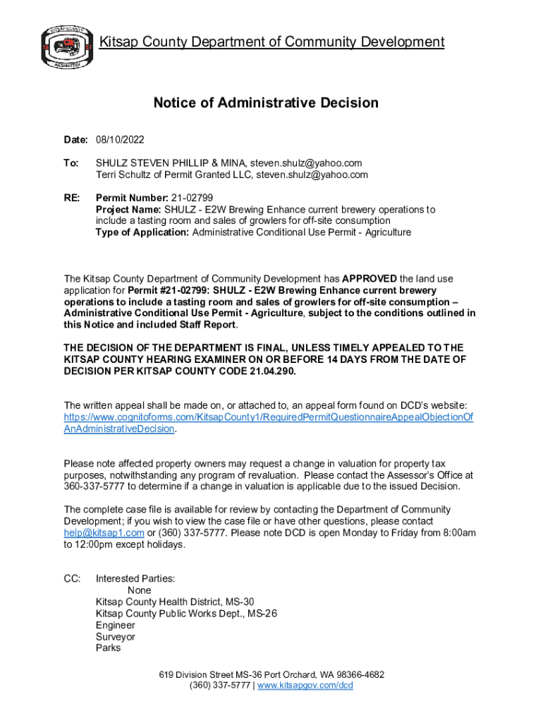 This document provides a notice of the approval for the Administrative Conditional Use Permit granting permission for E2W Brewing to expand its operations to include a tasting room and sales of growlers