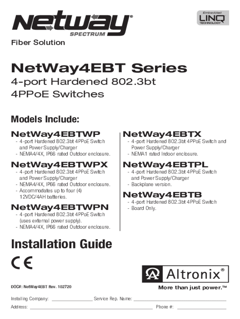Embedded Fiber SolutionNetWay4EBT Series 4port Hardened 802.3bt 4PPoE Switches Models Include: NetWay4EBTWPNetWay4EBTXNetWay4EBTWPXNetWay4EBTPL 4port Hardened 802.3bt 4PPoE Switchand Power Supply/Charger