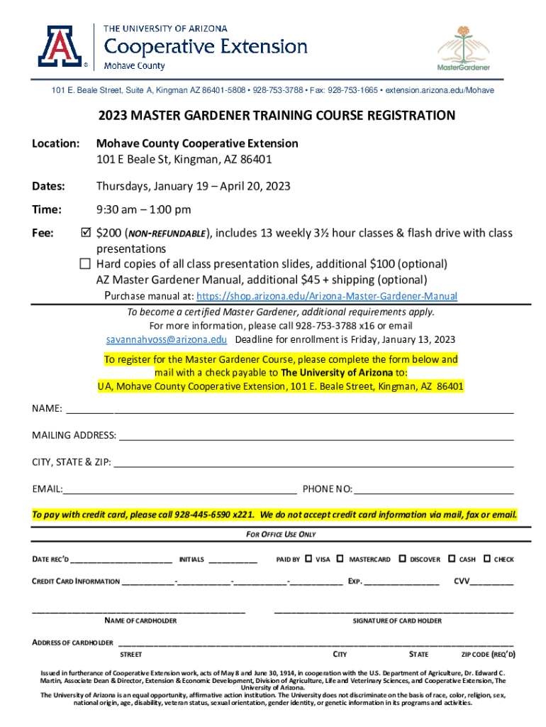 101 E. Beale Street, Suite A, Kingman AZ 864015808 9287533788 Fax: 9287531665 extension.arizona.edu/Mohave2023 MASTER GARDENER TRAINING COURSE REGISTRATION Location:Mohave County Cooperative Extension