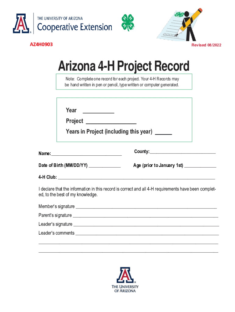 The Arizona 4-H project record is a document used by 4-H members to track their experiences, achievements, and personal growth within a specific project area.