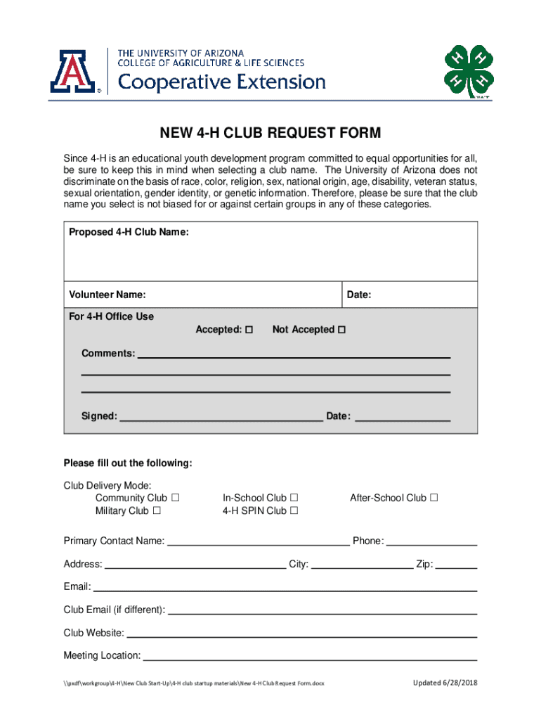 Get the free New 4-h Club Request Form - extension arizona