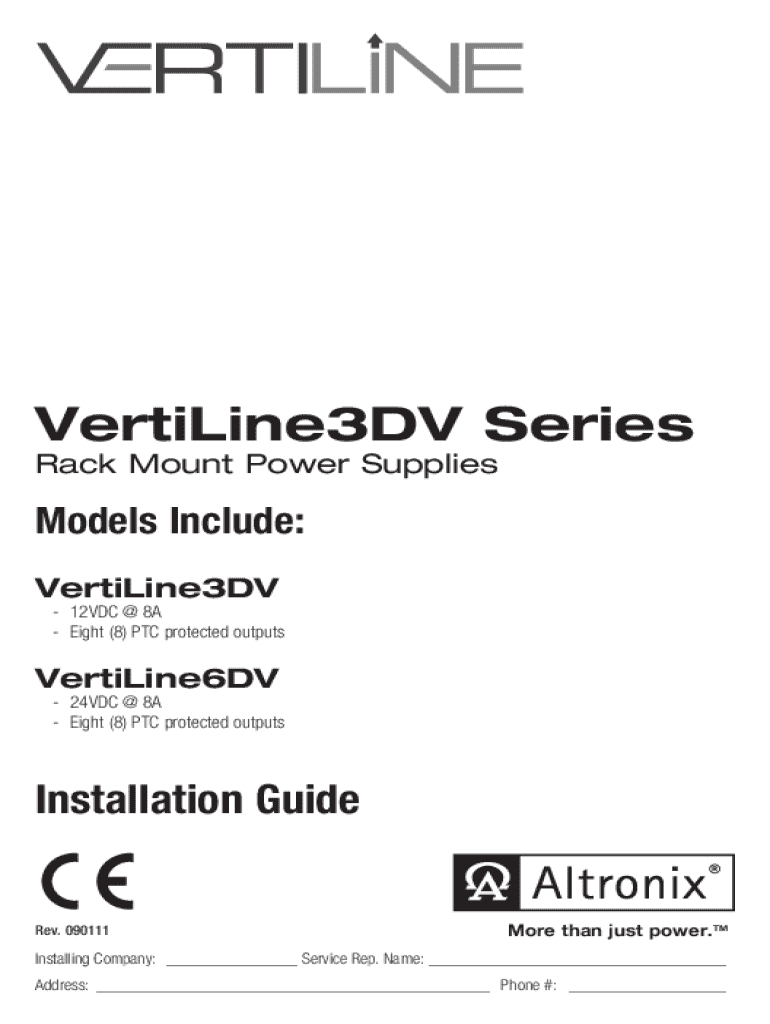 VertiLine3DV Series Rack Mount Power SuppliesModels Include: VertiLine3DV 12VDC @ 8A Eight (8) PTC protected outputsVertiLine6DV 24VDC @ 8A Eight (8) PTC protected outputsInstallation Guide Rev. 090111More