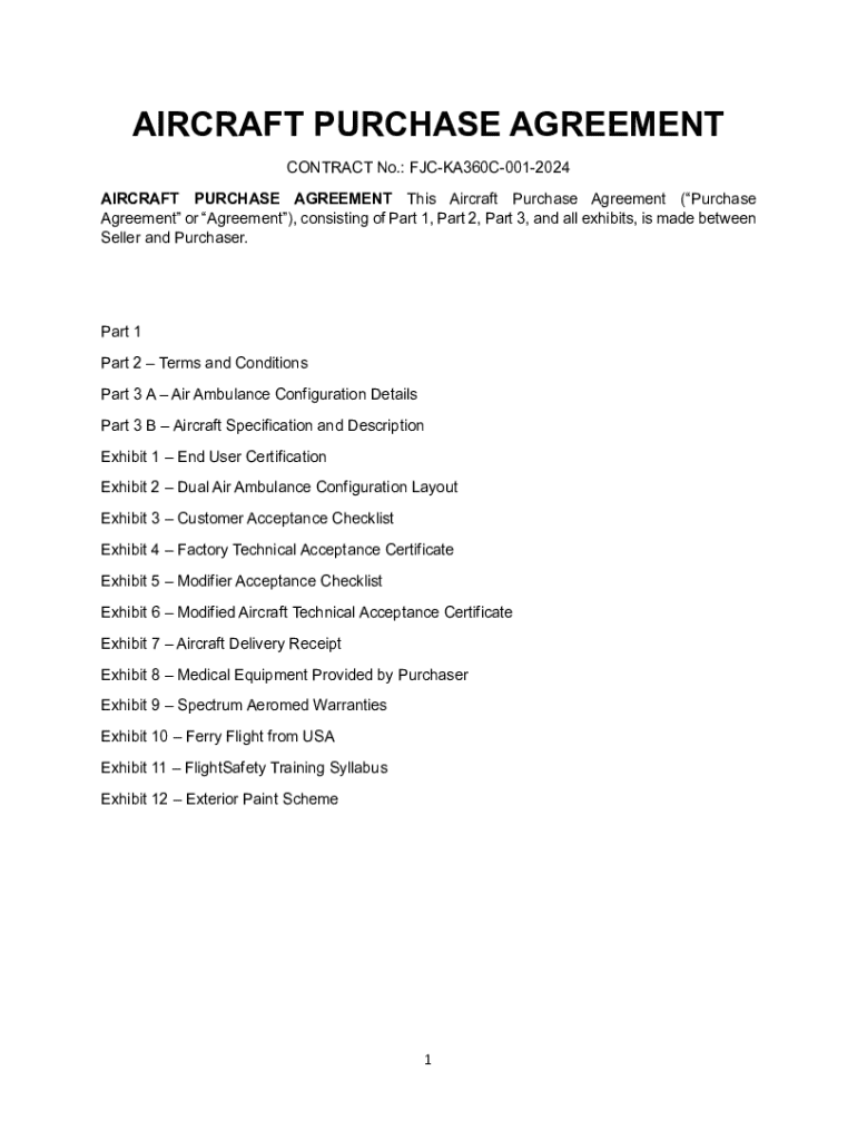 This Aircraft Purchase Agreement outlines the terms and conditions for the purchase of one King Air 360C aircraft, including specifications, payment terms, modifications for air ambulance configuration,