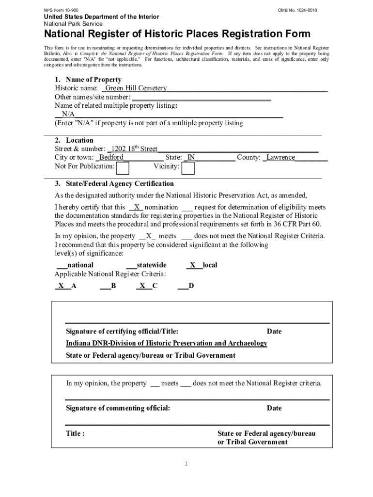 This form is for use in nominating or requesting determinations for individual properties and districts, specifically focused on historic sites like Green Hill Cemetery in Lawrence County, Indiana.