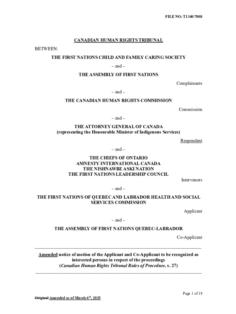 FILE NO: T1340/7008CANADIAN HUMAN RIGHTS TRIBUNAL BETWEEN: THE FIRST NATIONS CHILD AND FAMILY CARING SOCIETY and THE ASSEMBLY OF FIRST NATIONS Complainants and THE CANADIAN HUMAN RIGHTS COMMISSION