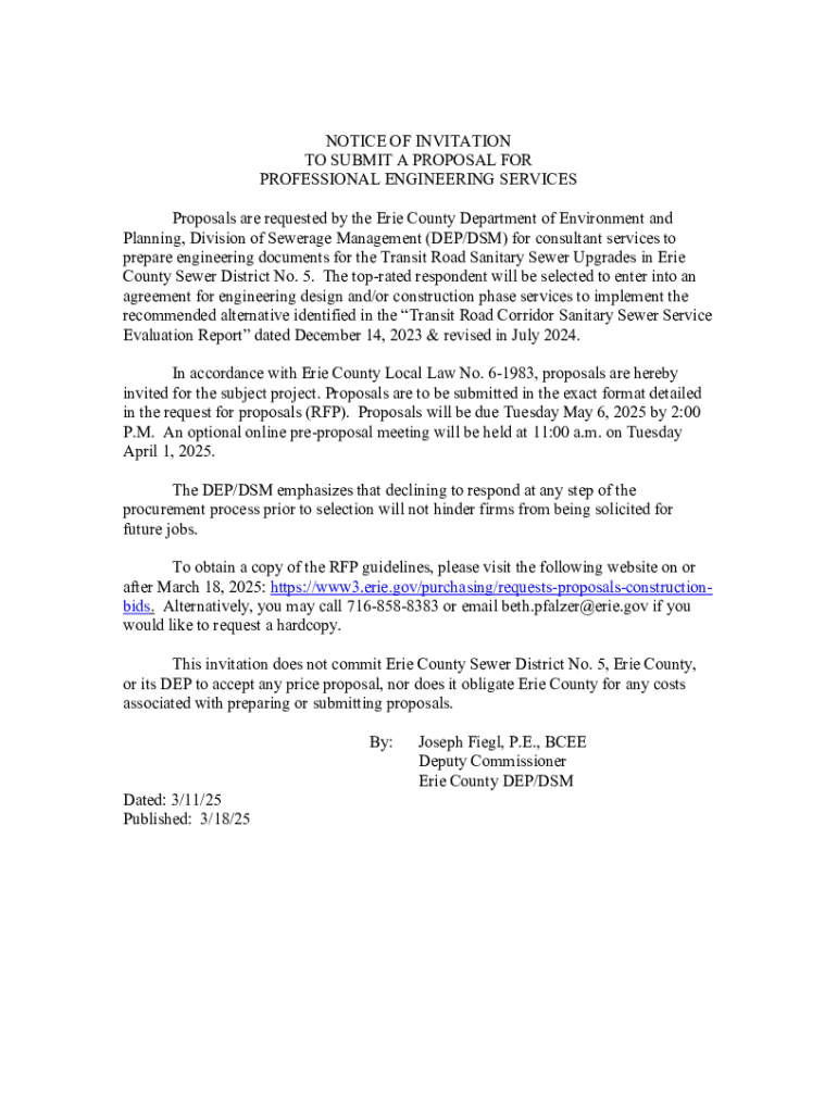 Proposals are requested by the Erie County Department of Environment and Planning for engineering consultant services to prepare documents for the Transit Road Sanitary Sewer Upgrades in Erie County