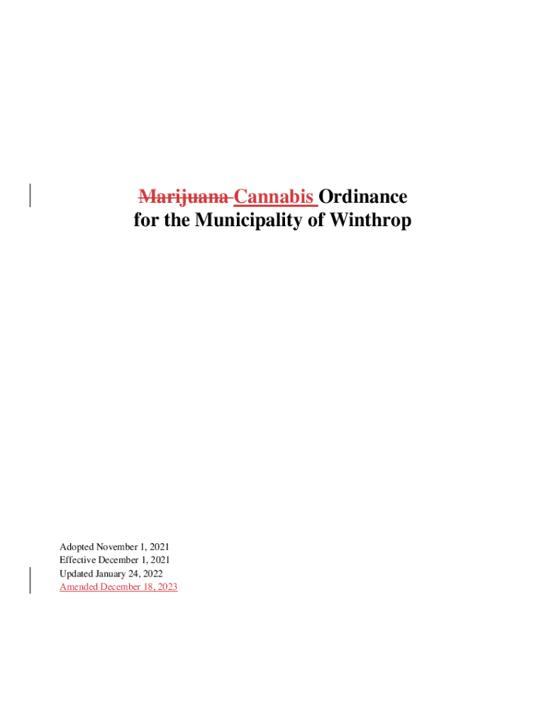 Marijuana Cannabis Ordinance for the Municipality of WinthropAdopted November 1, 2021 Effective December 1, 2021 Updated January 24, 2022 Amended December 18, 20232Table of ContentsARTICLE I General