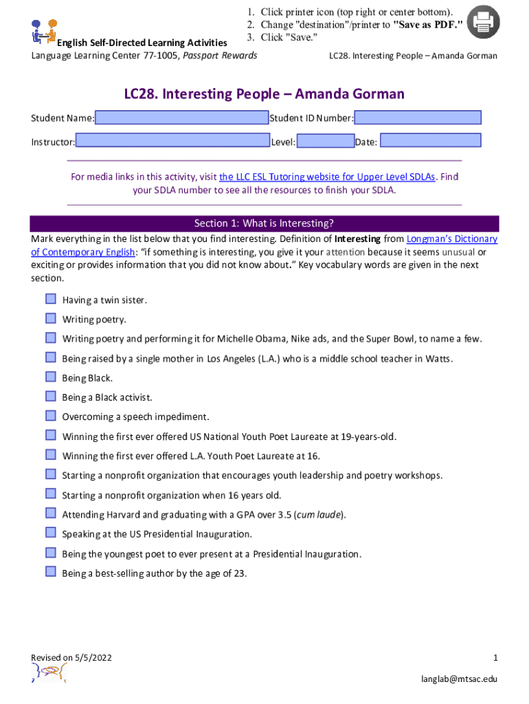 Este documento es una actividad de aprendizaje autodirigido sobre Amanda Gorman que incluye secciones de vocabulario, análisis de poesía y creación de un mantra. Los estudiantes interactúan con