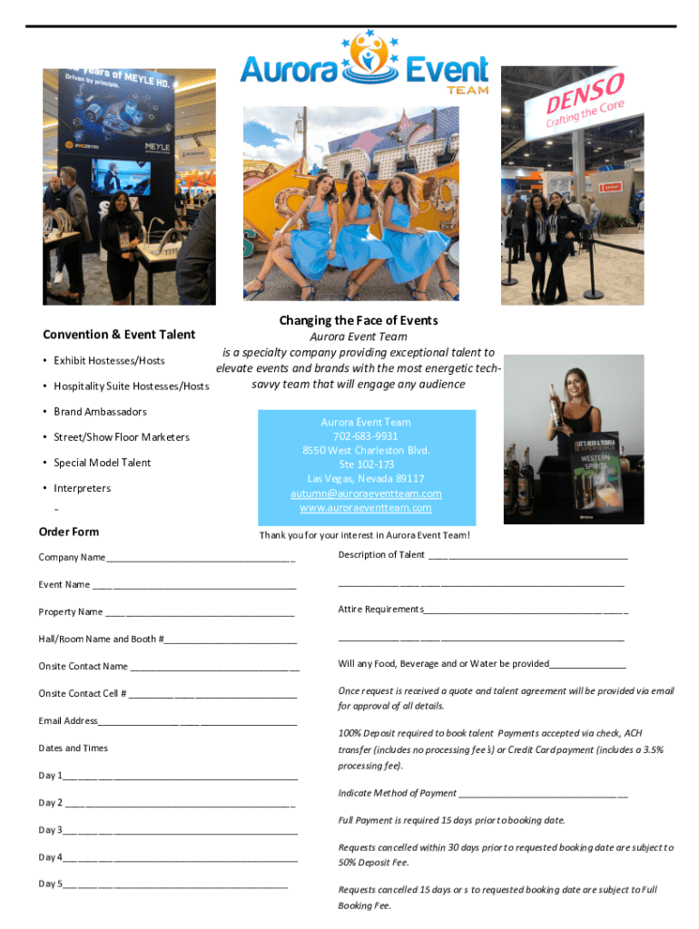 Este formulario permite solicitar talento especializado para eventos y convenciones a través de Aurora Event Team, incluyendo anfitriones, embajadores de marca y más, asegurando que cada evento