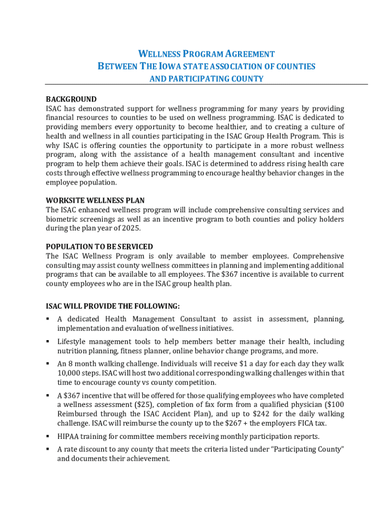 Este acuerdo detalla la participación de los condados en el programa de bienestar ISAC, incluyendo incentivos para empleados, servicios de consultoría, y herramientas de gestión de salud para fomentar