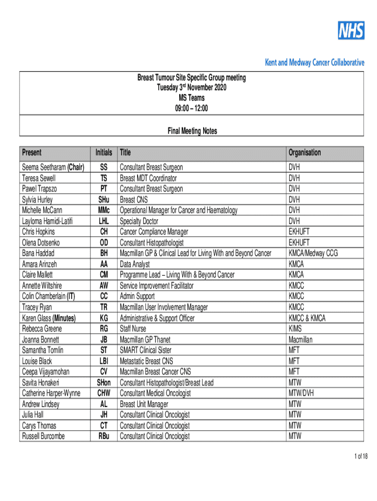 This document contains the final notes from the Breast Tumour Site Specific Group meeting held on November 3rd, 2020. It includes attendance details, discussions on cancer recovery phases, updates