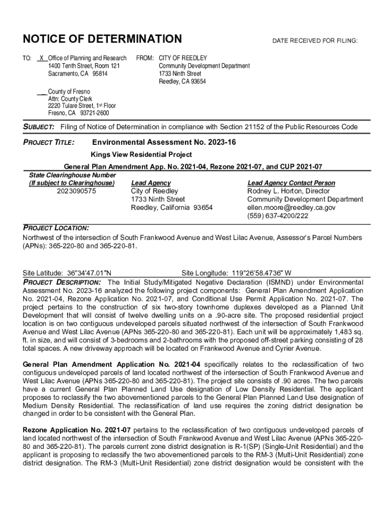 Este documento es una notificación de determinación relacionada con el proyecto Kings View Residential, que incluye un análisis de evaluación ambiental y la aprobación de un Negative Declaration