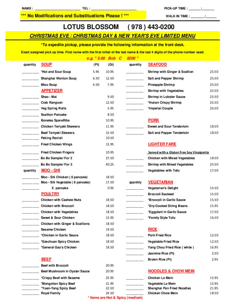 NAME : ___ TEL : ___PICKUP TIME : ___:___*** No Modifications and Substituations Please ! ***LOTUS BLOSSOMWALK IN TIME : ___:___( 978 ) 4430200CHRISTMAS EVE / CHRISTMAS DAY & NEW YEAR\'S EVE LIMITED