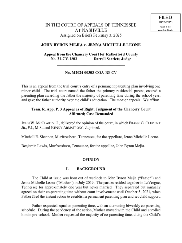 IN THE COURT OF APPEALS OF TENNESSEE AT NASHVILLE03/25/2025Assigned on Briefs February 3, 2025 JOHN BYRON MEJIA V. JENNA MICHELLE LEONE Appeal from the Chancery Court for Rutherford County No. 21CV1803