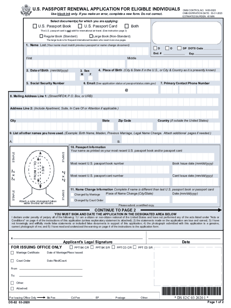 This document is an application for individuals seeking to renew their U.S. passport. It includes sections for personal information, passport details, and emergency contact information, along with