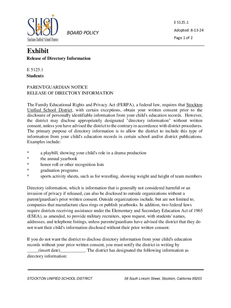 This document serves as a notice to parents/guardians regarding the release of directory information under the Family Educational Rights and Privacy Act (FERPA). It outlines the circumstances under