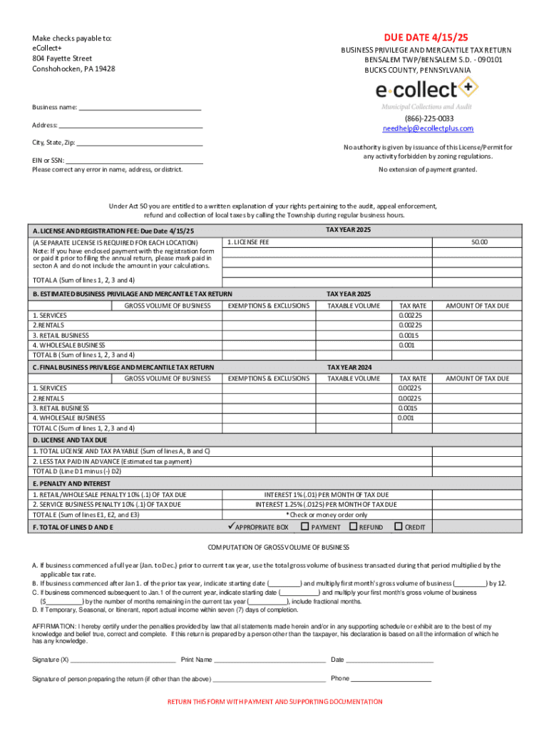 This document is used for submitting the Business Privilege and Mercantile Tax Return for Bensalem Township and Bensalem School District in Bucks County, Pennsylvania. It includes sections for reporting