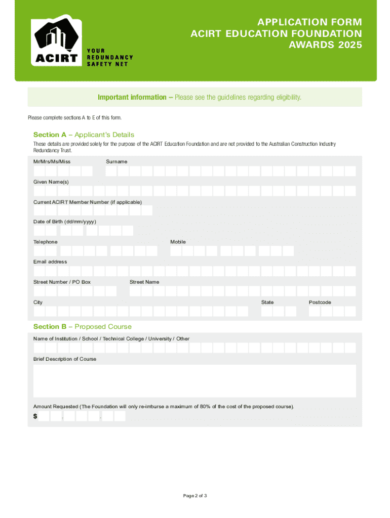 This document provides the guidelines and application details for the ACIRT Education Foundation Awards for members or nominated individuals pursuing building-related courses of less than 12 months.