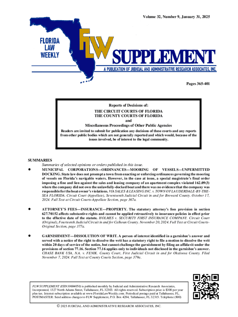 Volume 32, Number 9, January 31, 2025Pages 365401Reports of Decisions of: THE CIRCUIT COURTS OF FLORIDA THE COUNTY COURTS OF FLORIDA and Miscellaneous Proceedings of Other Public Agencies Readers