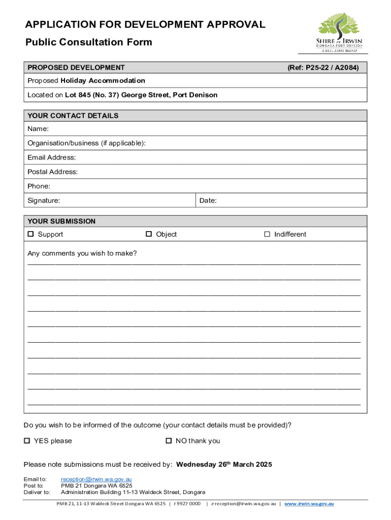 This form is intended for public consultation regarding a proposed holiday accommodation development located at Lot 845 (No. 37) George Street, Port Denison. Individuals can express their support,