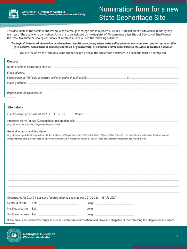 This document is the nomination form for a new State geoheritage site in Western Australia, allowing public or organizational proposals for inclusion in the Register of Western Australian Sites of