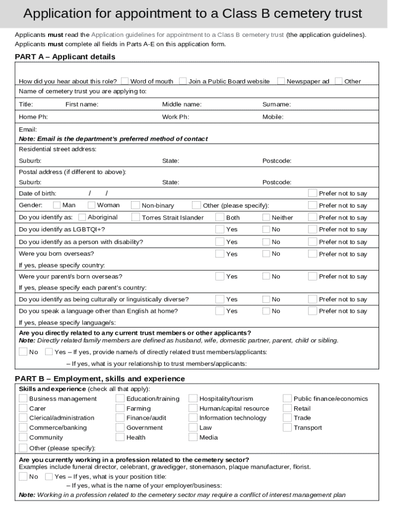 Instructions for the Applicants must read the Application guidelines for appointment to a Class B cemetery trust (the application guidelines) form