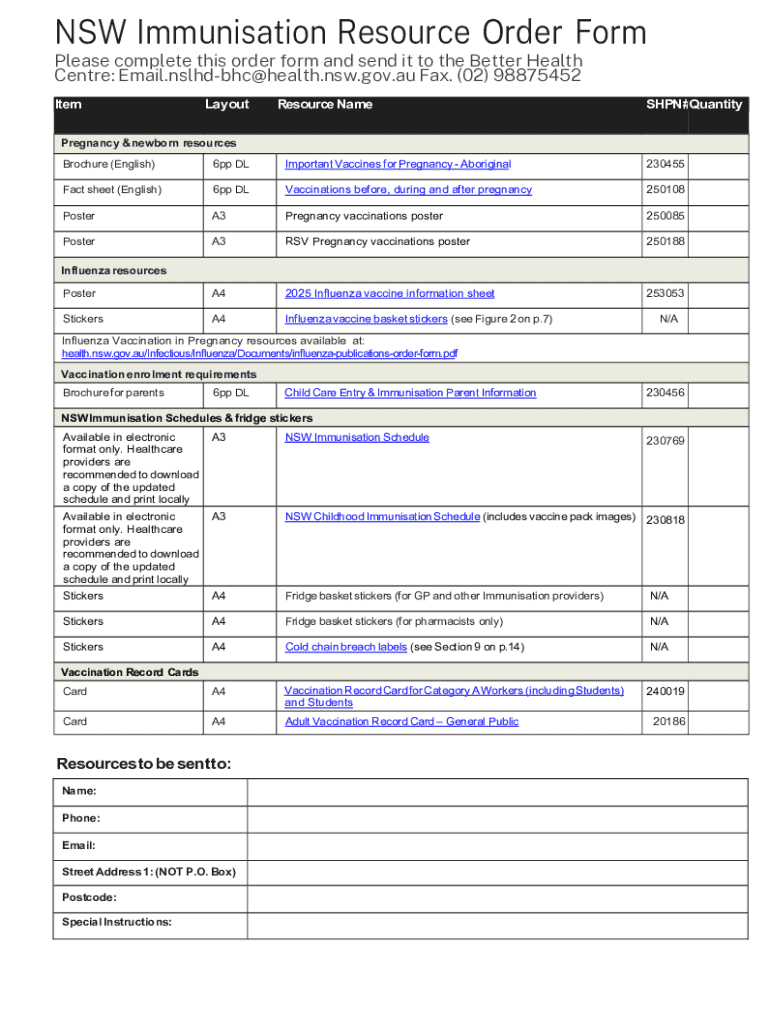 The NSW Immunisation Resource Order is a request form used by healthcare providers in New South Wales to order vaccines and immunisation resources necessary for vaccination programs.