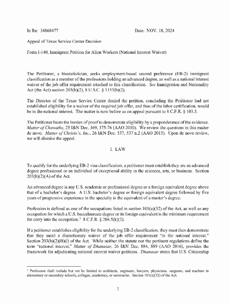 In Re: 34868477Date: NOV. 18, 2024Appeal of Texas Service Center Decision Form 1140, Immigrant Petition for Alien Workers (National Interest Waiver)The Petitioner, a biostatistician, seeks employmentbased