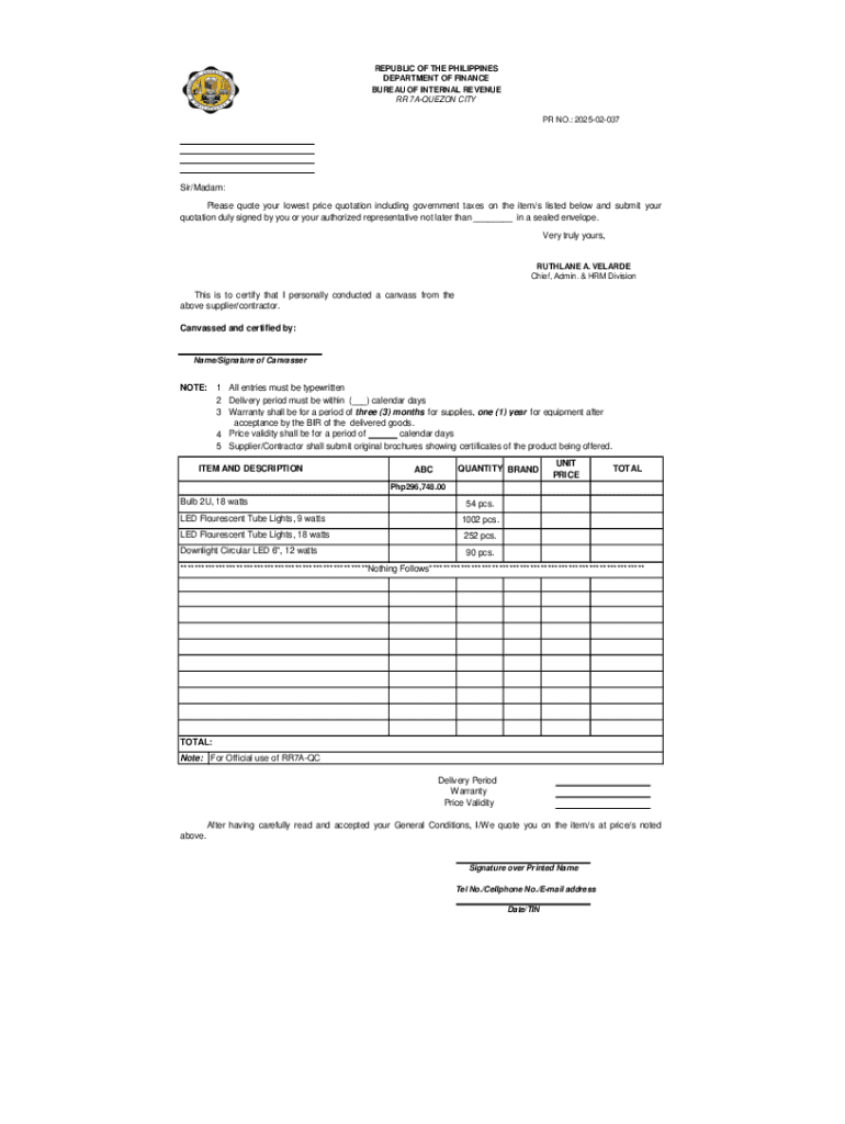 REPUBLIC OF THE PHILIPPINES DEPARTMENT OF FINANCE BUREAU OF INTERNAL REVENUE RR 7AQUEZON CITY PR NO.: 202502037 ___ ___ ___ ___Sir/Madam: Please quote your lowest price quotation including government