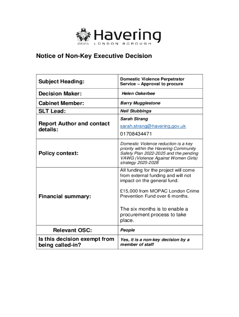 This document seeks approval to extend the existing Domestic Violence Perpetrator Service contract with Cranstoun for six months at a total value of £15,000 to allow a full commissioning process,