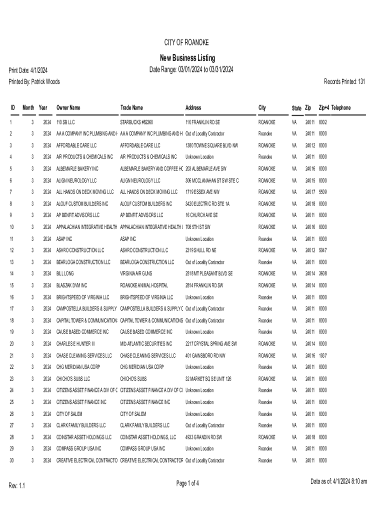 This document contains a listing of new businesses registered in the City of Roanoke for the date range of March 1, 2024, to March 31, 2024. It includes details about the business owner, trade name,