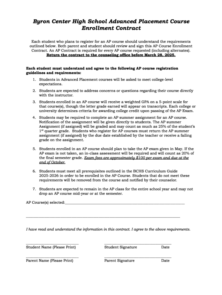 This contract outlines the requirements and expectations for students enrolling in Advanced Placement courses at Byron Center High School. It specifies the responsibilities of students and parents,