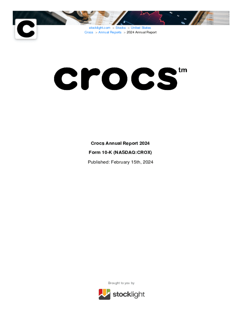 This is the 2024 Annual Report for Crocs, Inc., which includes financial information, management\'s discussion and analysis, risk factors, and other disclosures pertinent to stakeholders.