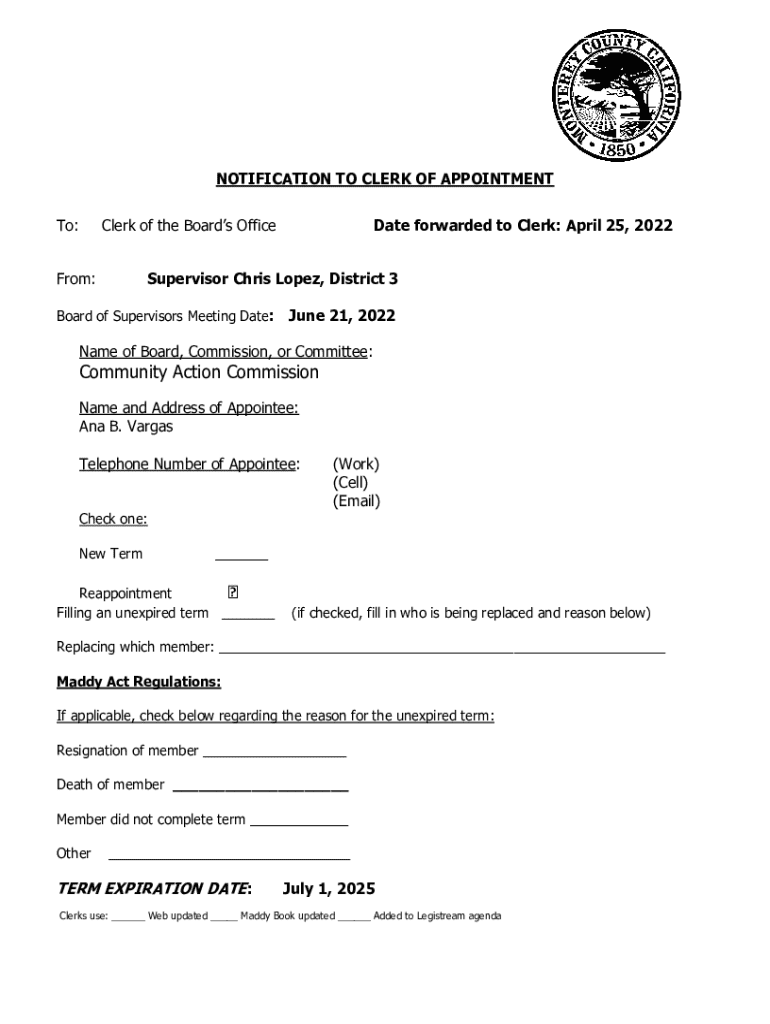 This document serves to notify the Clerk of the Board\'s Office regarding the appointment of Ana B. Vargas to the Community Action Commission, detailing the terms of the appointment, including confirmation