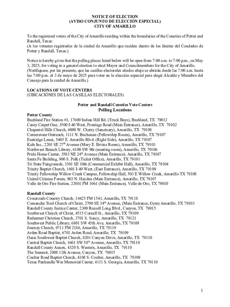 Este documento notifica a los votantes registrados de la ciudad de Amarillo sobre los lugares de votación y los horarios para la elección general programada el 3 de mayo de 2025, donde se elegirán