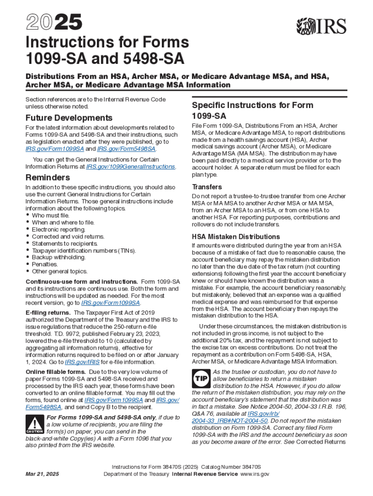 2025Instructions for Forms 1099SA and 5498SA Distributions From an HSA, Archer MSA, or Medicare Advantage MSA, and HSA, Archer MSA, or Medicare Advantage MSA Information Section references are to
