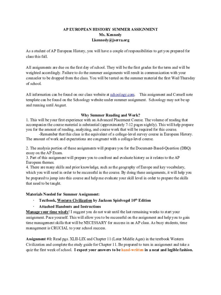 This document outlines the summer assignments and responsibilities for students enrolled in AP European History. It includes a reading list, a study guide for Chapter 11 of the textbook, vocabulary