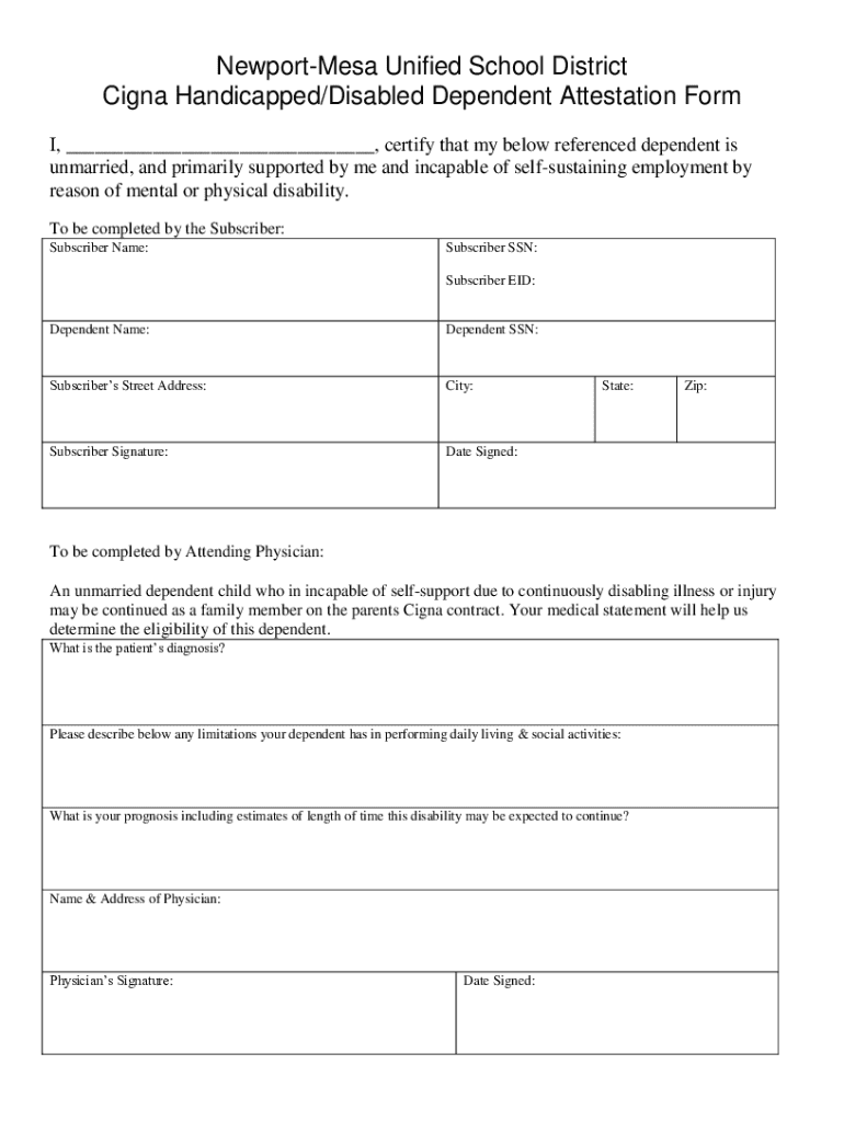 The Cigna Handicapped/Disabled Dependent Attestation is a form used to verify the status of dependents who are handicapped or disabled in order to ensure eligibility for specific benefits under Cigna's insurance plans.