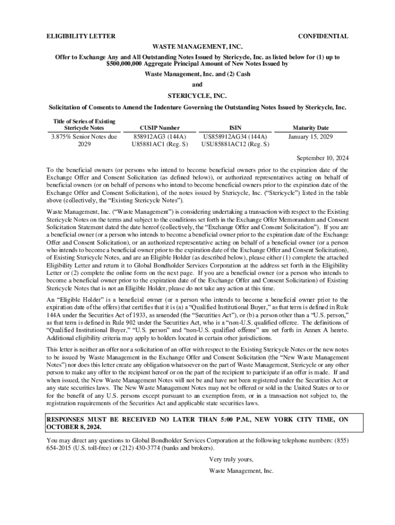 This document serves as an Eligibility Letter for beneficial owners or authorized representatives of Existing Stericycle Notes. It outlines the process for exchanging outstanding notes issued by Stericycle,