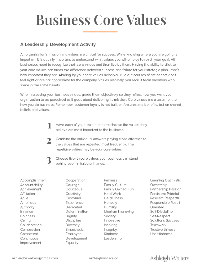 Business Core Values A Leadership Development Activity An organizations mission and values are critical for success. While knowing where you are going is important, it is equally important to understand