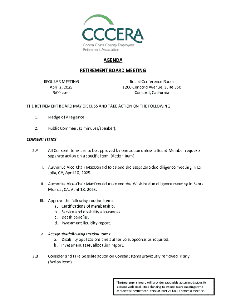 AGENDA RETIREMENT BOARD MEETING REGULAR MEETING April 2, 2025 9:00 a.m.Board Conference Room 1200 Concord Avenue, Suite 350 Concord, CaliforniaTHE RETIREMENT BOARD MAY DISCUSS AND TAKE ACTION ON THE