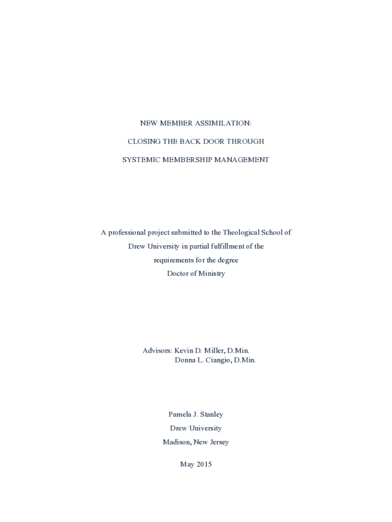 This document is a professional project submitted to the Theological School of Drew University, exploring the assimilation of new members at Brooklyn Community Church through systemic membership management.