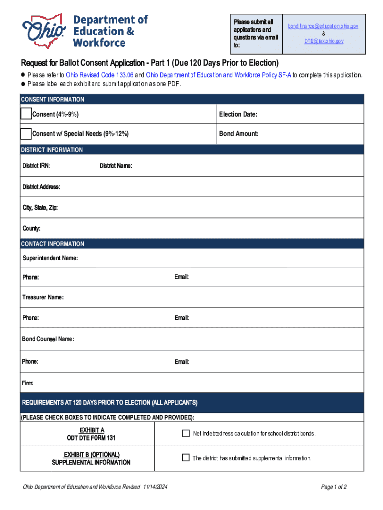 This document is a request for ballot consent application that must be submitted by school districts in Ohio, detailing the necessary information and documentation required for bond elections. It