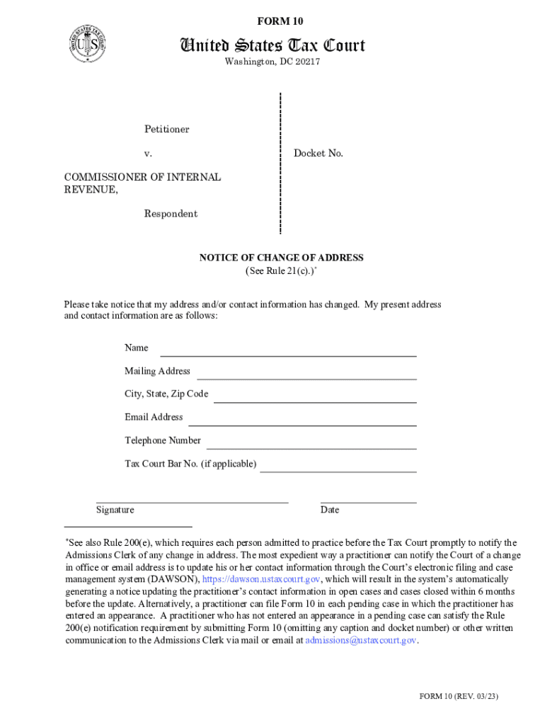 This form is used to notify the United States Tax Court of a change in address and/or contact information for petitioners and practitioners.