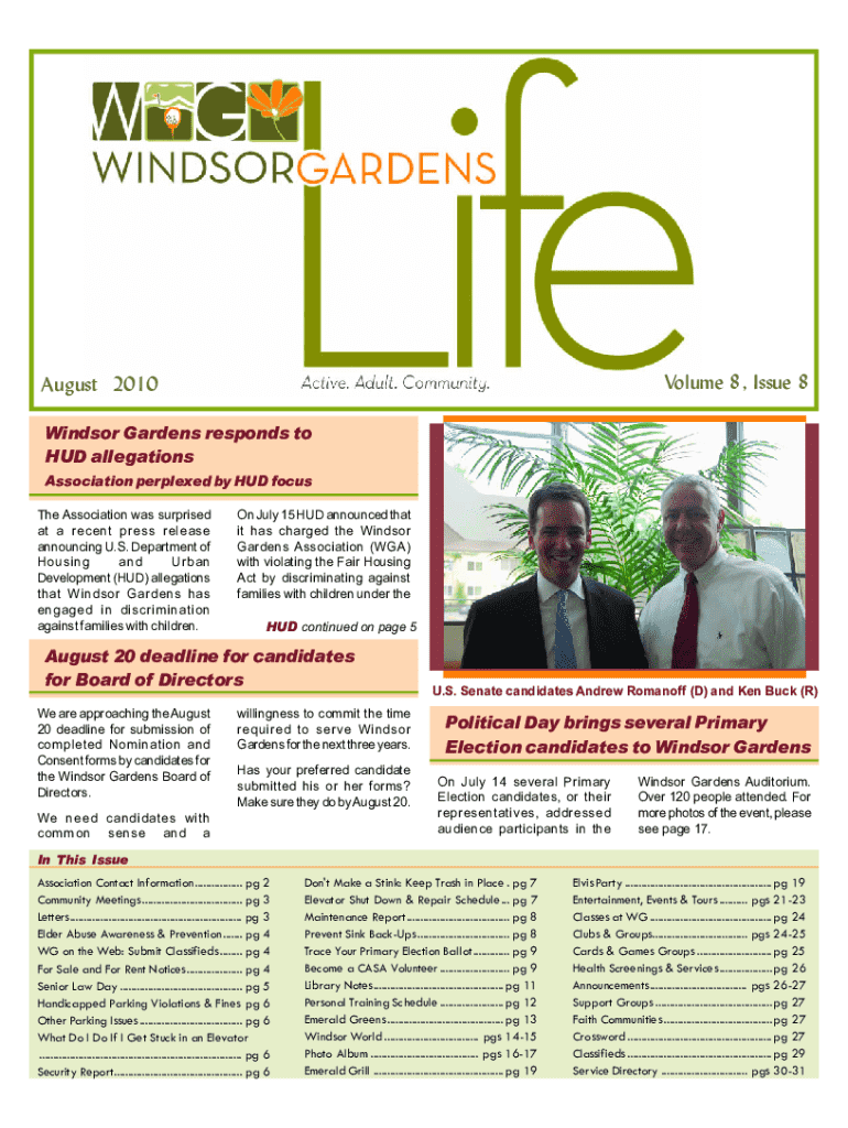 This document contains news and updates from the Windsor Gardens community, including association responses to HUD allegations, upcoming board of directors elections, community events, health awareness