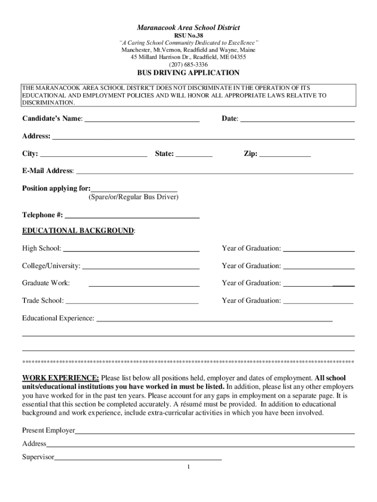 This application is for candidates applying for a bus driver position within the Maranacook Area School District. The form collects personal information, educational background, work experience, and