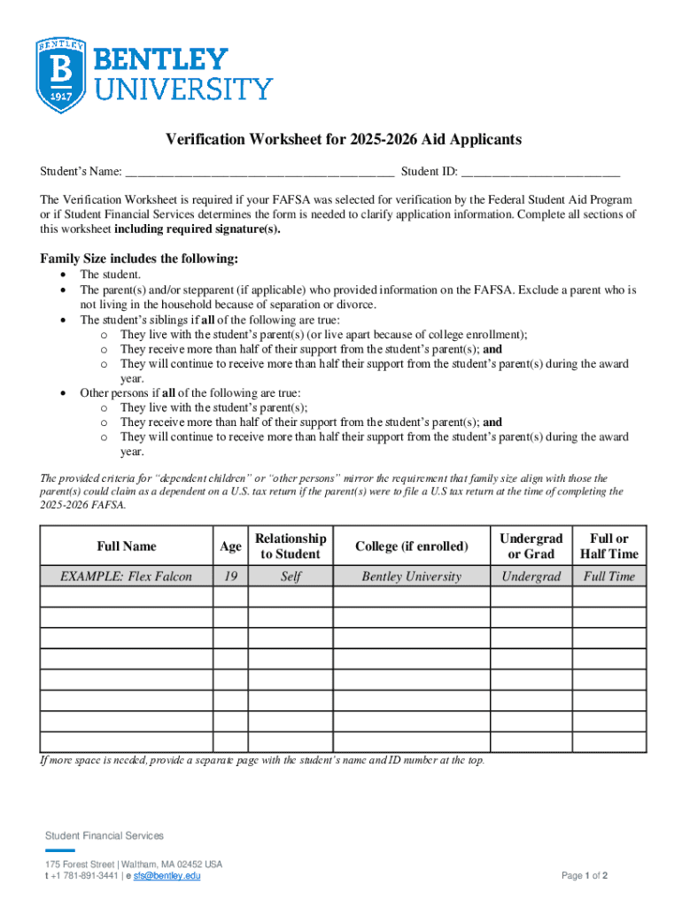 Get the free Verification Worksheet for 2025-2026 Aid Applicants