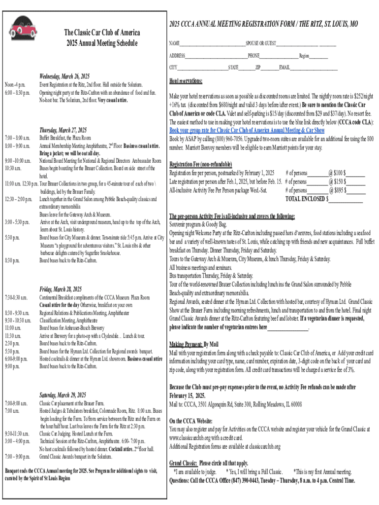 Form for registering participants for the 2025 Annual Meeting of the Classic Car Club of America, detailing the schedule of events from March 26 to March 29, 2025, at the Ritz-Carlton in St. Louis,